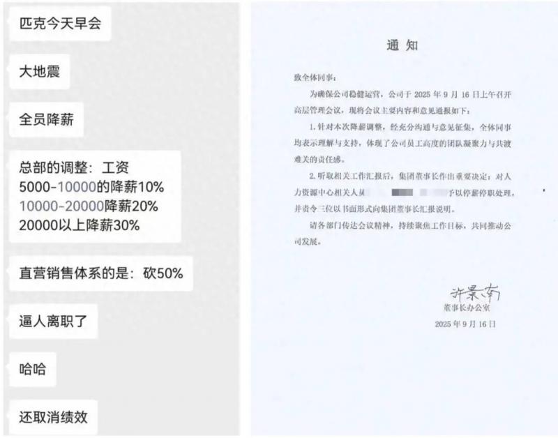 降薪流程的合规性同样受到质疑。根据劳动法,企业若因经营严重困难需全员降薪,需与工会或职工代表协商。但据匹克员工反映,降薪通知是在发薪日前4天口头下达的,没有书面文件、没有一对一沟通、没有签字确认。就连许景南落款的那份通知,也是在发完工资后才出现的。