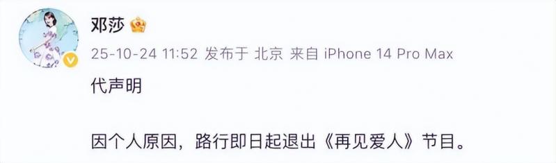 随即,一连串“异常动作”接踵而至:10月17日,创联控股公告路行辞任;10月23日,《再见爱人5》宣布节目延播;10月24日,邓莎代发声明,确认路行退出节目。
