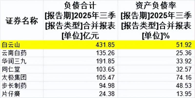 截至2025年三季度末,白云山总负债高达432亿元。这是什么概念呢?去年营收规模排在第2-4位的云南白药、华润三九、同仁堂的负债分别为135.26亿元、191.85亿元、103.65亿元。白云山一家的负债就超过这三家的总和。