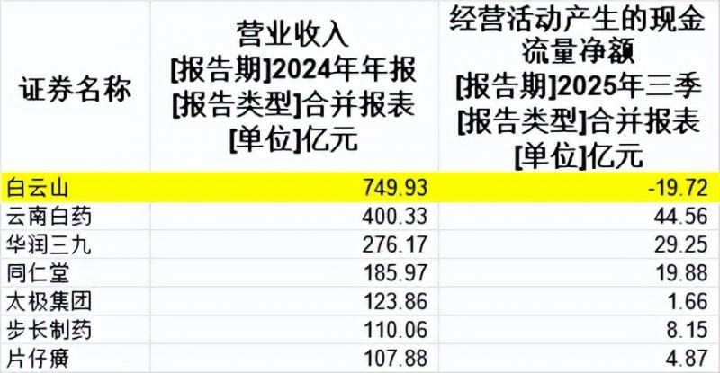 中药企业一向以高毛利、强现金流著称,但白云山今年前三季度经营现金流净流出近20亿元,在中药头部上市公司(以去年营收超百亿为标准)里,也就只有白云山在“失血”。