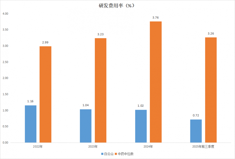2022-2024年及2025年前三季度,中药行业的研发费用率中位数分别只有2.99%、3.23%、3.76%、3.26%,但这也大幅领先作为龙头的白云山,同期白云山研发费用率分别只有1.16%、1.04%、1.02%和0.72%。今年前三季度的研发费用率,居然连1%都没有。