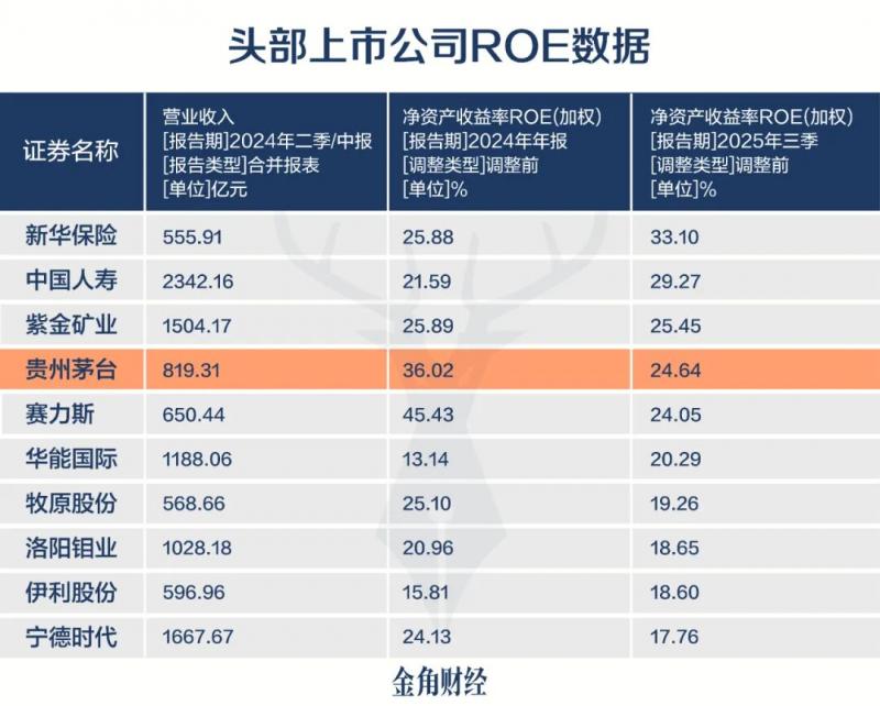 茅台一直不缺价值投资的“铁粉”,其中一个关键就是它惊人的ROE。2025年前三季度,贵州茅台的ROE为24.64%,意味着2025年的ROE有望在30%以上。