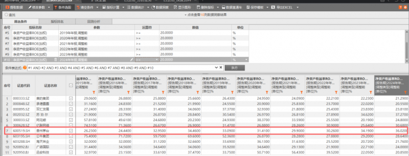 这反映出,茅台ROE不仅高,而且稳。事实上,A股几千家公司里,过去十年每年都能稳稳维持ROE在20%以上的,只有11家。茅台就是其中之一,也是唯一一只白酒股。
