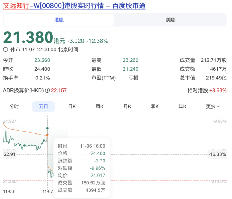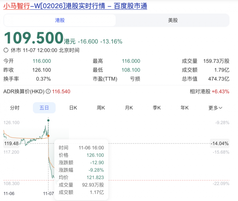 11月6日首日挂牌,市场用"脚"投票,双方均以大幅下跌收场。小马智行的发行价为139港元,但收盘时未能守住,报126.10港元,首日跌幅9.28%,导致市值从发行时的约592.52亿港元缩水至538.76亿港元,单日蒸发53.76亿港元。