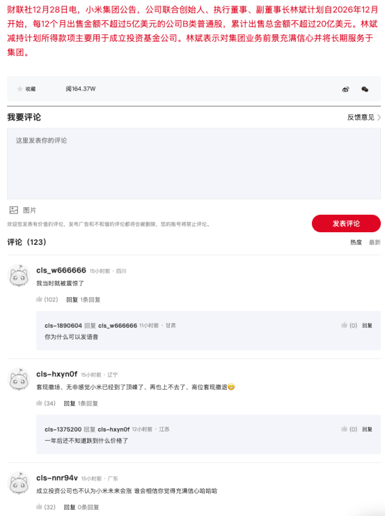 市场关注度和情绪剧烈波动,不难理解。如果说此前的财务投资人离场是“落袋为安”,那作为二号人物的林斌套现离场,就很容易在社媒评论区里看到类似直白的潜台词:“宁愿成立投资公司去外面看机会,也不想再赌小米的未来。”