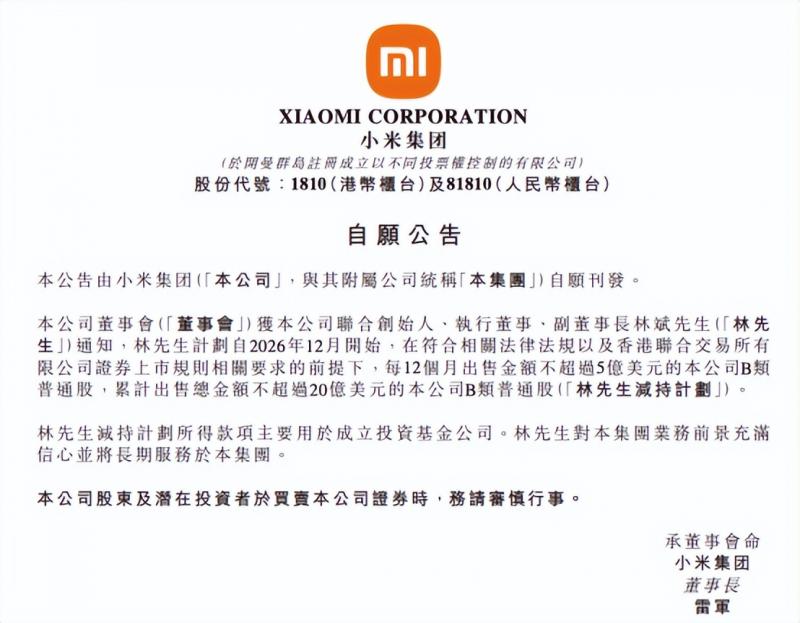 小米联合创始人、副董事长林斌披露,计划在未来数年内将累计减持不超过 20 亿美元公司股份。