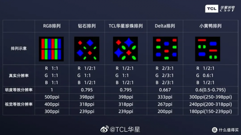 那国产厂商就另辟蹊径。比如京东方,研发出了全新的 “蓝钻排列”,文字边缘的细腻程度已经和三星钻排相差无几了;华星光电这边,除了上面提到的全 RGB 排列外,还有“珍珠排列”等,让国产的屏幕在清晰度这块不再“恐韩”。
