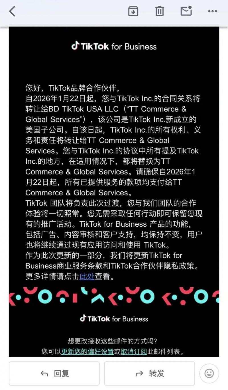 与此同时,为了维持产品体验的一致性,字节跳动全资控股的TikTok美国公司将继续承担“全球互联互通”的核心职能:内容网络不割裂,用户仍可与全球社区互动;电商、广告、市场运营等商业化核心业务,仍由字节主导推进。