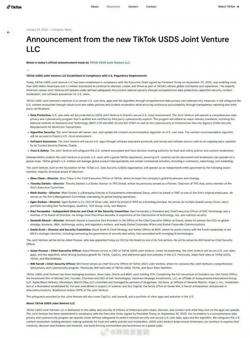 北京时间1月23日,TikTok官方发布声明称,已成立TikTok美国数据安全合资有限责任公司(TikTok USDS Joint Venture LLC,简称TikTok USDS)。