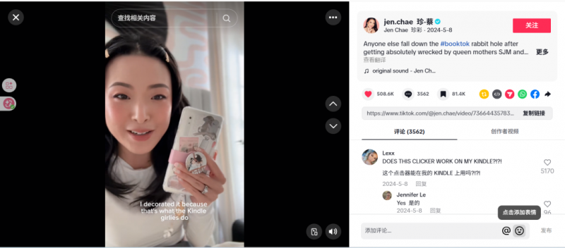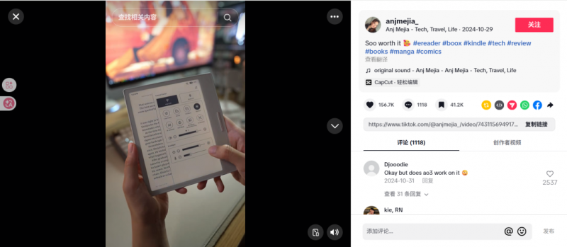 不仅限于此,文石BOOX也在其他领域下足了红人营销。在与TikTok美妆博主jen.chae的合作中,以软广的形式分享了产品的使用,收获了50.8万点赞,3500条评论,为文石BOOX在海外带来了大量的用户关注和良好反馈。
