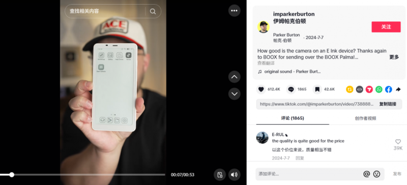 如TikTok一科技类头部博主anjmejia选择口播的方式,来对产品进行了实际使用的展示,这条视频获得了15.6万次点赞以及1000多条评论。另一TikTok区安卓数码博主imparkerburton Parker Burton也是用“口播+现场使用展示”的方式,收获了61.2万点赞、1800多条评论。