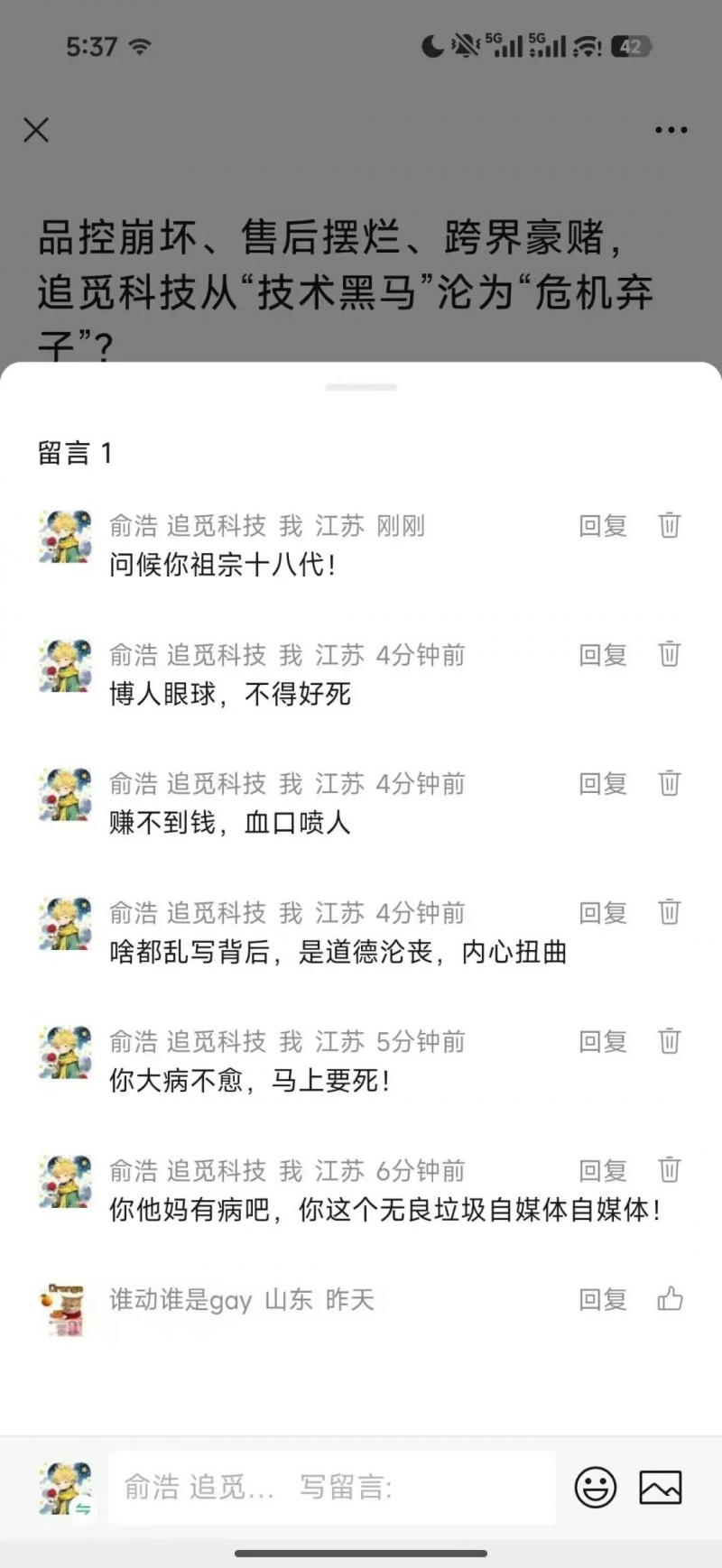 在一篇讨论追觅现状的自媒体文章评论区,俞浩在 5 分钟内连续发布 6 条评论,措辞直接、激烈,甚至粗俗,对文章观点和作者本人展开密集反击。
