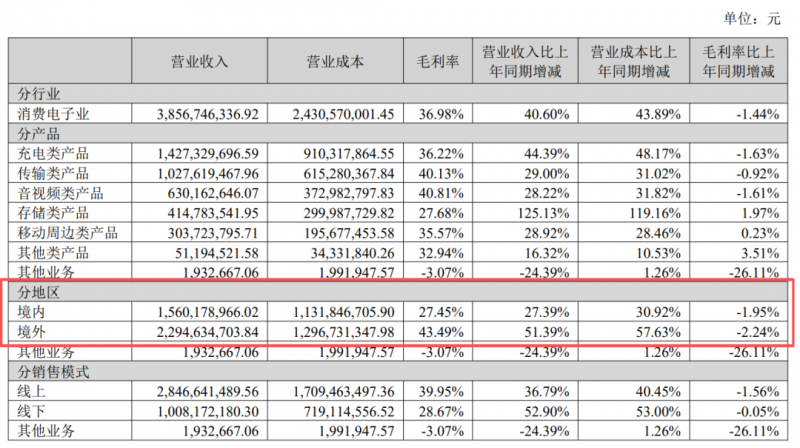 海外业务也带来了丰厚的回报。2024年,绿联海外收入35亿元,占比57%;2025年上半年,境外收入22.95亿元,占比已接近60%,增速明显高于境内市场的27.39%。在资本市场更关注的毛利率上,绿联境外业务毛利率高达43.49%,大幅领先境内27.45%的水平。