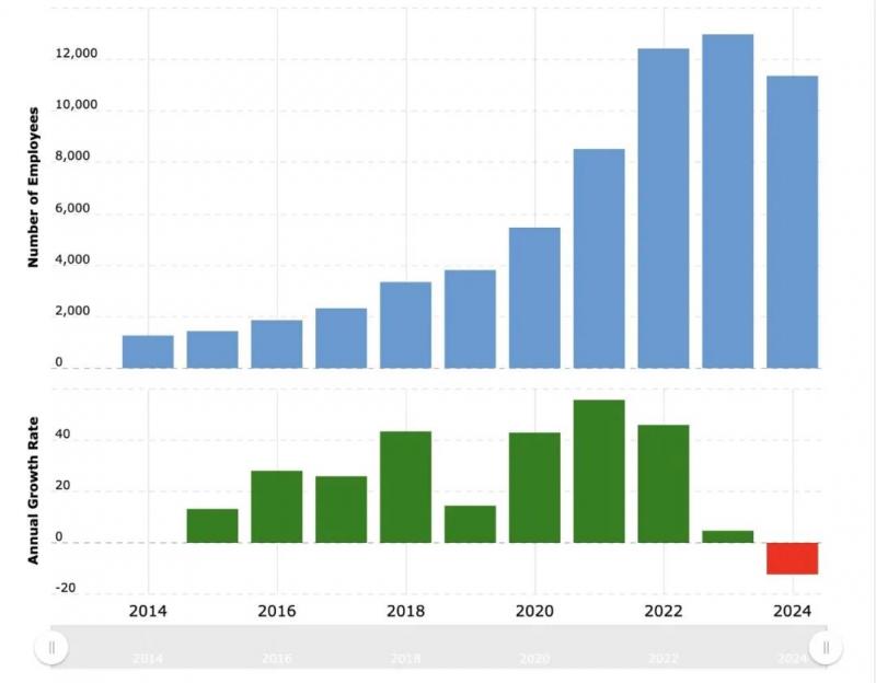 于是,从 2024 年开始,Block已经开始削减人数,从 1.2 万人的高位,降至 1 万人左右;最终在 2 月的大裁员里,让雇员人数重新回到 6000 人左右。