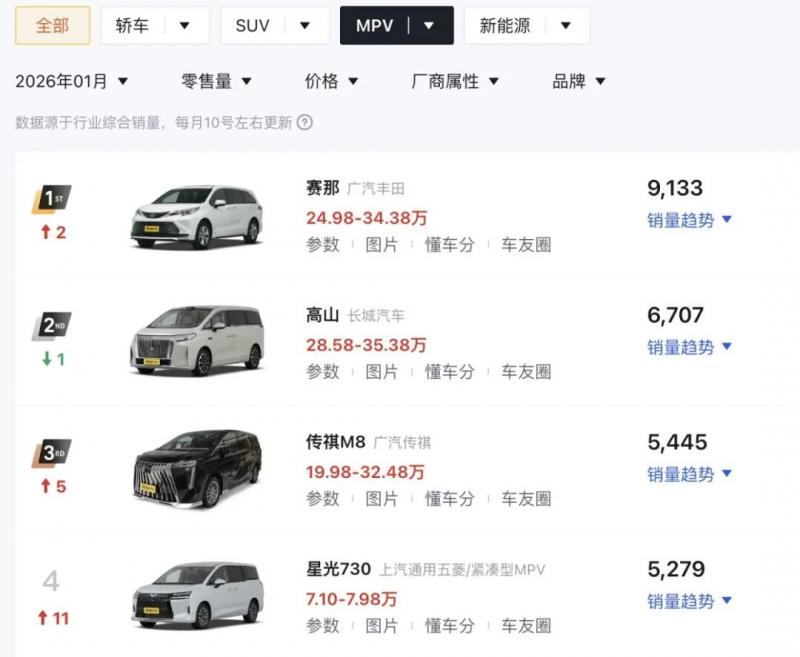 2026 年 1 月,MPV 销量榜第一还是丰田赛那 9133 辆;新能源/混动阵营里最能打的魏牌高山 6707 辆;而曾经的“新能源 MPV 销冠”腾势 D9 也只剩 2552 辆。