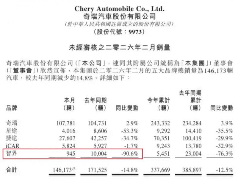 3 月的第一个工作日,奇瑞汽车发布的最新产销快报显示:智界今年 2 月销量 945 辆,相较去年同期的10004 辆下滑 90.6%。