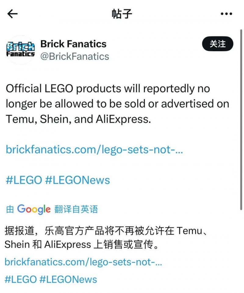 不久前,积木行业权威媒体Brick Fanatics披露,乐高已正式通知其全球供应链合作伙伴,禁止在Temu、Shein、AliExpress这三家平台上销售任何乐高官方产品,现有在售乐高产品立即下架,包括套装和单个迷你人偶。