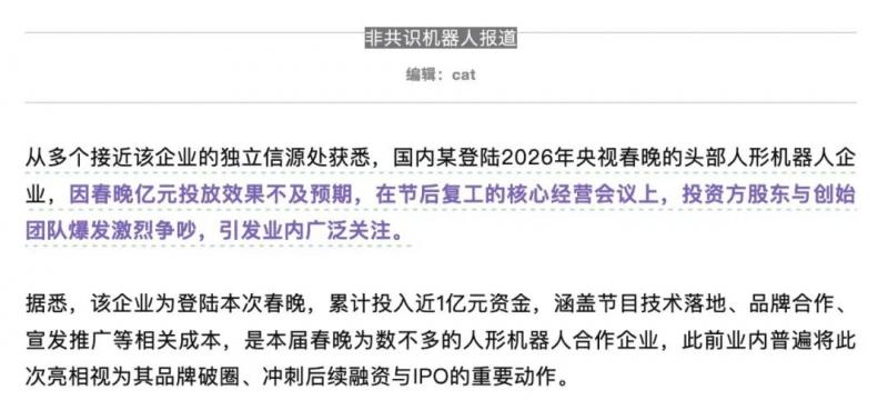“从多个接近该企业的独立信源处获悉,国内某登陆 2026 年央视春晚的头部人形机器人企业,因春晚亿元投放效果不及预期,在节后复工的核心经营会议上,投资方股东与创始团队爆发激烈争吵…”