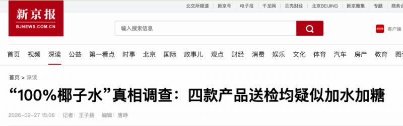 近日,《新京报》将四款市面主流“100%椰子水”送往欧洲机构检测,结果显示,送检产品全部检出外源水或外源糖。