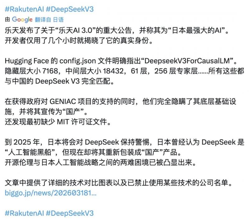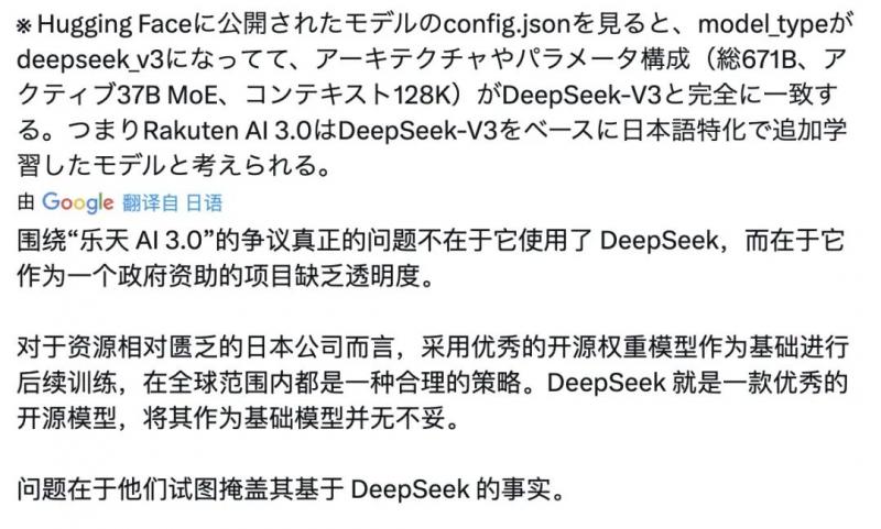 但Rakuten AI 3.0 的问题在于,在发布的时候它丝毫没有提及使用了DeepSeek V3 的架构,还搬出了“自主研发”“日本最强”“日本最大”等限定词,看上去真的是由乐天从 0 到 1,自主鼓捣出来的大模型。