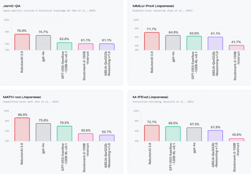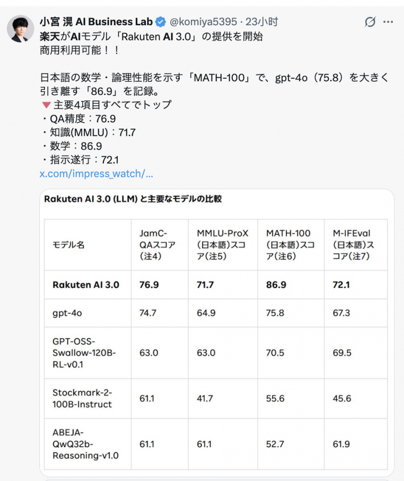 根据乐天官方陆续公布的数据,Rakuten AI 3.0 的纸面成绩其实相当能打。