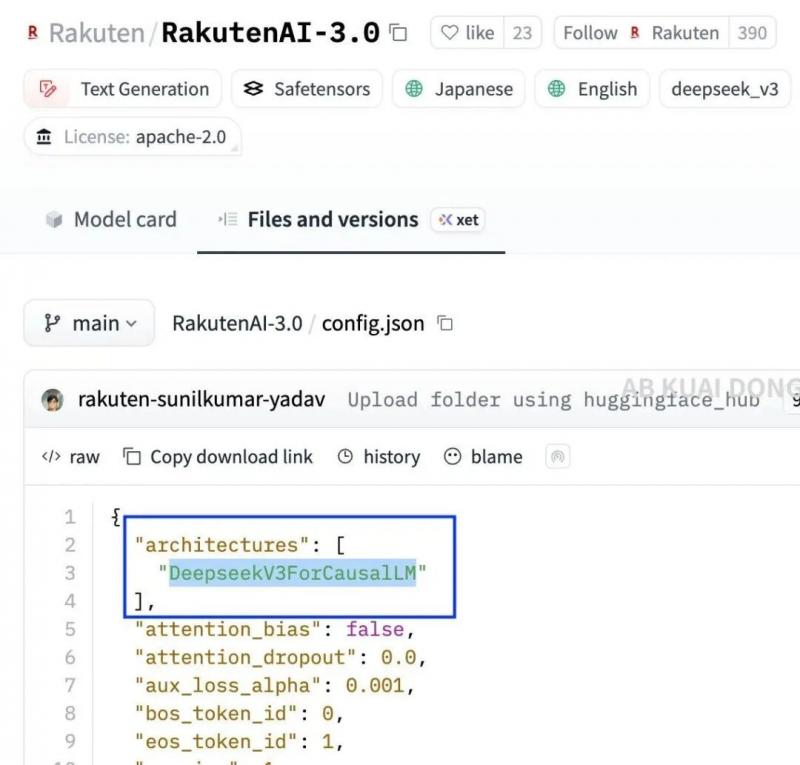 甚至乐天都没有过多的“掩饰”,因为Rakuten AI 3.0赫然在Hugging Face上的config.json文件里写着: