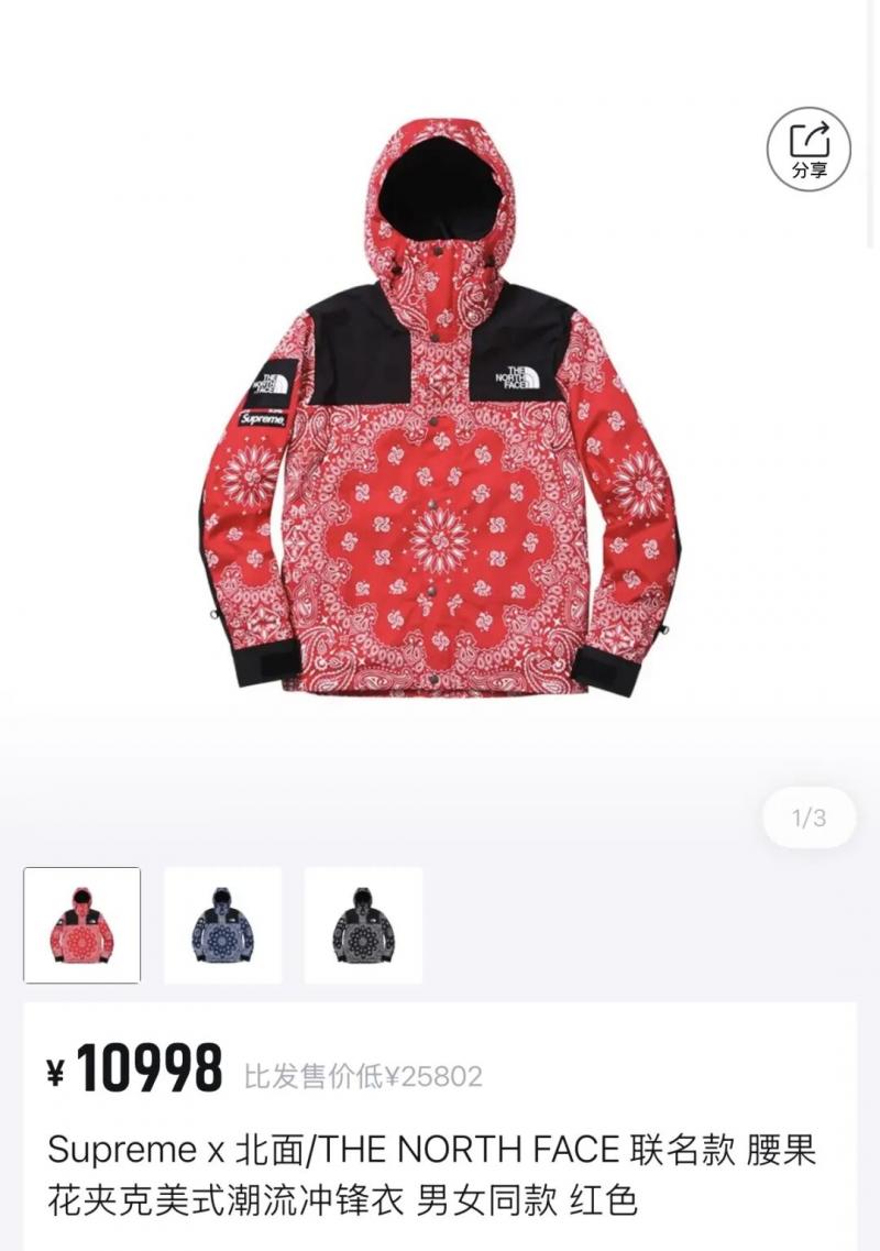尤其是与潮牌Supreme展开的数十次联名,让北面成功切入了大众潮流圈。遥想在2014年,那件横空出世的北面×Supreme腰果花花纹冲锋衣,曾让多少95后、00后心甘情愿掏光压岁钱。在问世12年后,在潮流交易平台得物上仍挂着上万元的标价。