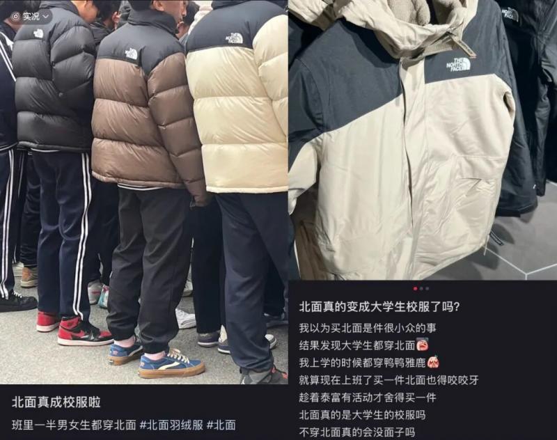 两三千元的北面,成了价格、面子与保暖之间的最大公约数。“一届学生6000人,北面占去3000件”,这种认同感最后被浓缩进了社交媒体的段子里。