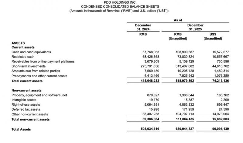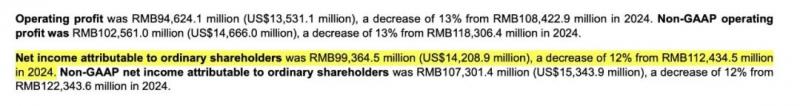 2025 年全年,拼多多归母净利润约 994 亿元,同比下滑 12%;Non-GAAP净利润 1073 亿元,也下滑了 12%。