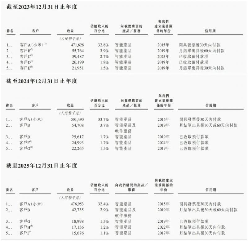 小米更是Aqara绿米的第一大客户,连续三年贡献了超三成的收入。招股书显示,2023-2025年,Aqara绿米来自小米的营收分别为4.716亿元、5.015亿元、4.770亿元,对应营收占比32.8%、33.7%、32.4%。三年来,这个比例几乎没有变化,且其他客户的规模与小米差距悬殊,有依赖单一客户的风险。