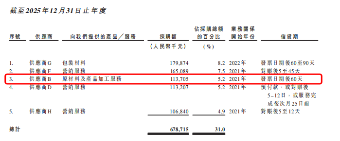 这是一家没有“工厂”的日化巨头。招股书显示,其核心产品完全依赖OEM代工,2023-2025年,其代工厂数均在10-15家之间,其中前五大供应商中,仅有“供应商B”负责原材料及产品加工服务的,且每年采购额占比分别仅为8.3%、8.5%、5.2%,其余供应商主要提供营销服务或包装材料。