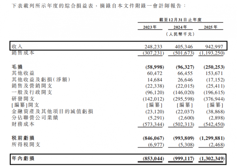这说明市场教育开始有了结果,客户验证也在推进,但亏损也同步放大:同期分别亏了8.53亿元、9.99亿元、13.02亿元;2025年的亏损同比扩大了30%,三年合计亏了31.5亿元。