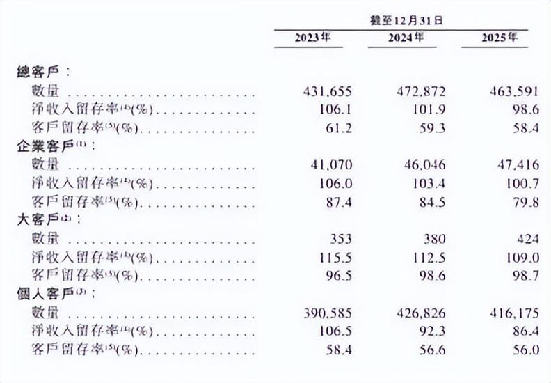 其中,个人客户的净收入留存率更是从 106.5% 下滑至 86.4%。这说明老客户贡献正在收缩,新增客户也还不足以完全对冲流失压力。