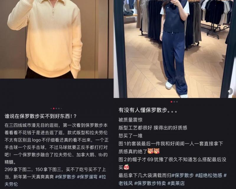 一边厢,有网友发帖提问,该如何调节穿山寨的羞耻感,“保罗的毛衣我都试穿800回了,怎么说服自己别内耗”;另一边厢,更多网友开始分享穿POLOWALK逛高端商场的日常,还甚至衍生出“穿保罗去遛弯”话题。不明就里的人,还以为是什么行为艺术。