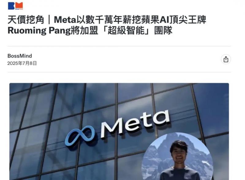 再到 2026 年 2 月,路透转述 The Information 报道称,OpenAI 从 Meta 挖走了原本从苹果过去的高管 Ruoming Pang(庞若鸣),而 Pang 去 Meta 时的薪酬包,据称价值超过 2 亿美元。