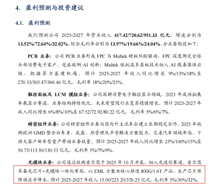 以国盛证券测算为例,东山精密光模块业务收入将从2025年的14.5亿元增长至2027年的300亿元以上,增幅超过20倍。