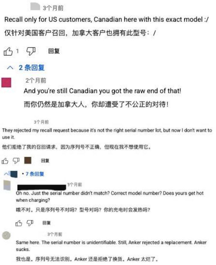 今年6月,有加拿大消费者表示安克在召回时遭到区别对待(仅在美国召回),还有海外消费者提到在申请召回时由于无法提供有效序列号,被安克拒绝退款换货。