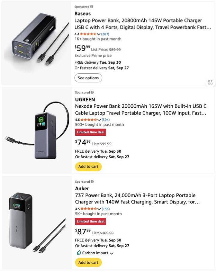 | 从上至下为倍思、绿联与安克生产的同类型移动电源在美国亚马逊的售价。