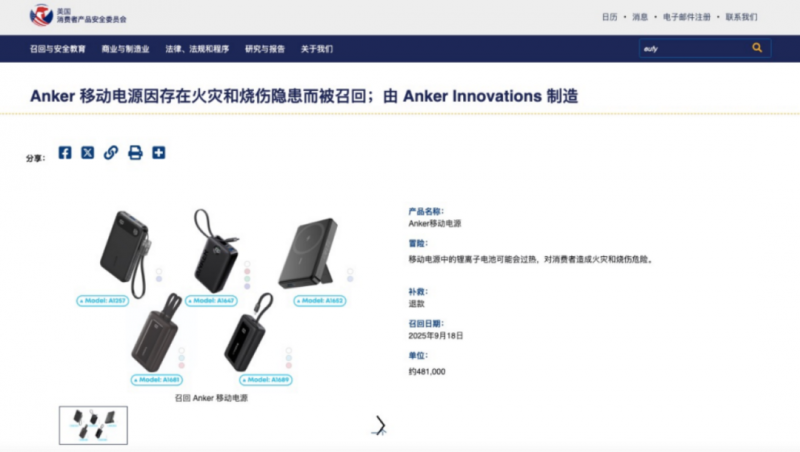 9月18日,美国消费者产品安全委员会(CPSC)宣布,因存在火灾和烧伤风险,安克主动召回约48.1万个充电宝;次日,美国众议院委员会又致函商务部长,要求对安克展开调查,指控其涉嫌不公平竞争与非法规避关税。