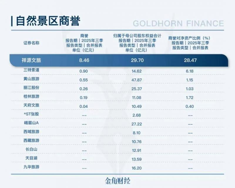 祥源文旅的并购战略,也在资产负债表上留下了明显痕迹。2022年末,祥源文旅商誉仅3.29亿元,2023年末增至5.32亿元,2024年末进一步升至7.26亿元,截至2025年三季度末已达8.46亿元。