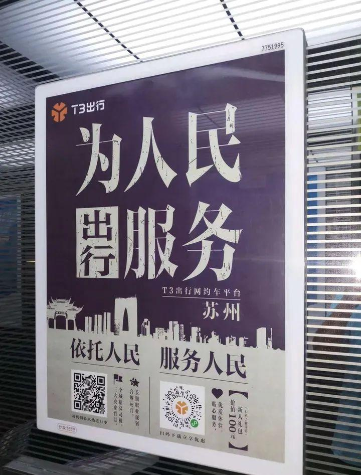 除了常规的拉新红包、100元的乘客补贴优惠券,T3出行甚至还在当时买下了巨量的分众电梯广告位,其“为人民出行服务”系列广告直接霸屏。